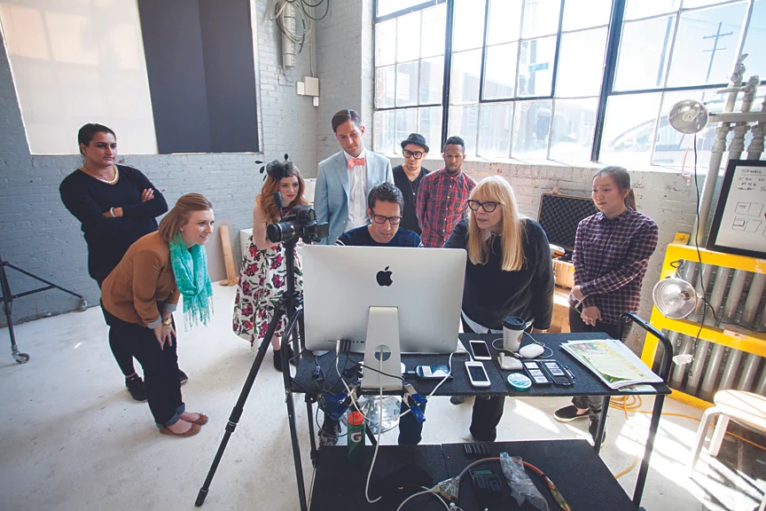 Sonda Andersson Pappan (standing at computer) working with the Virginia Living “Best of Virginia” team; photographer, stylist, models, hair + makeup, and assistant designers.